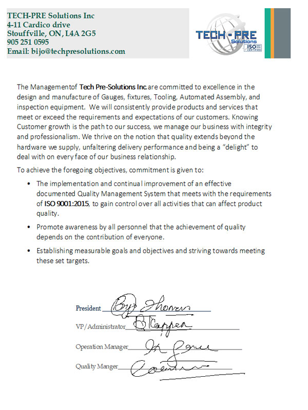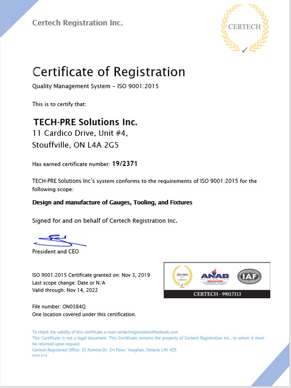 TECH-PRE is certified to ISO 9001:2015. Our quality management system is focused on providing knowledge based solutions to our customers.